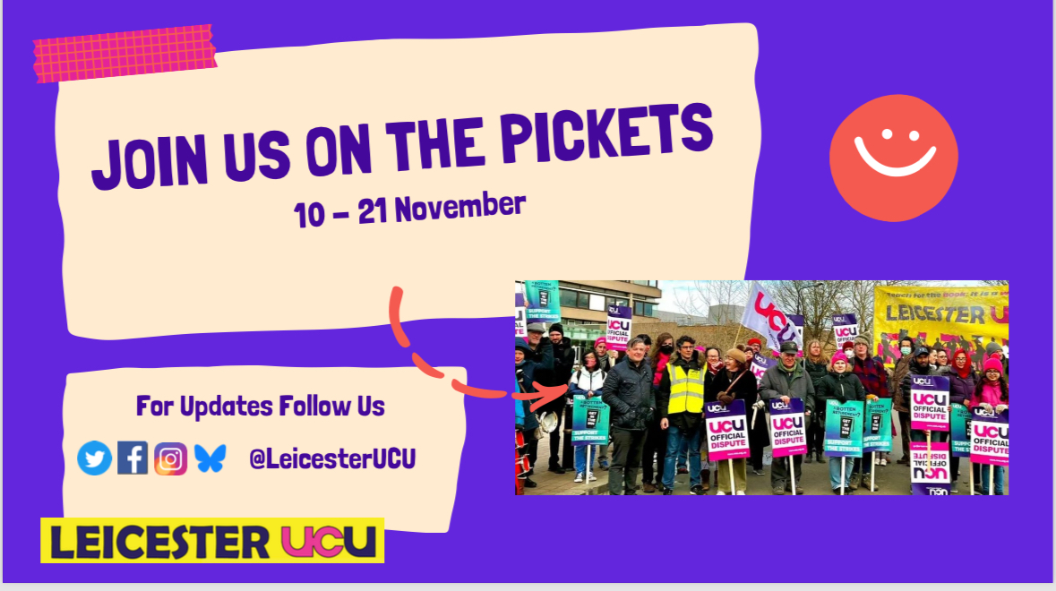 Leicester UCU Members will be on strike Monday 10 November – Friday 21 November. Here is some key information about the strike action and how you can get involved.