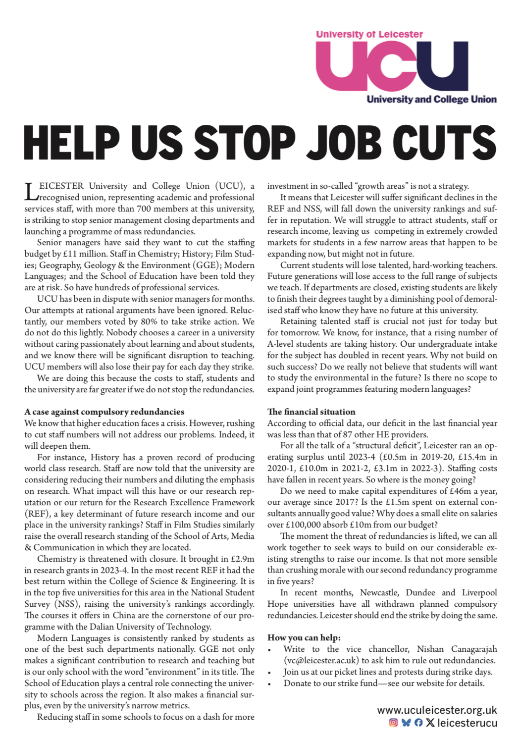 The University of Leicester is currently threatening to launch a redundancy programme in November 2025 with the goal of cutting the staffing budget by £11m. Six academic areas have been targeted for potential redundancies — Chemistry; Geography, Geology & the Environment (GGE); Modern Languages; History; Film Studies; and the School of Education. Hundreds of professional services staff across the university have also been through a pre-change engagement process, which may also lead to redundancies. Leicester University executive has already announced the first compulsory redundancy programme for the new academic year—targeting a group of academic-related professional services staff in the Division of Biomedical Services (DBS).